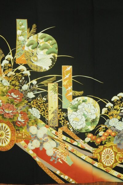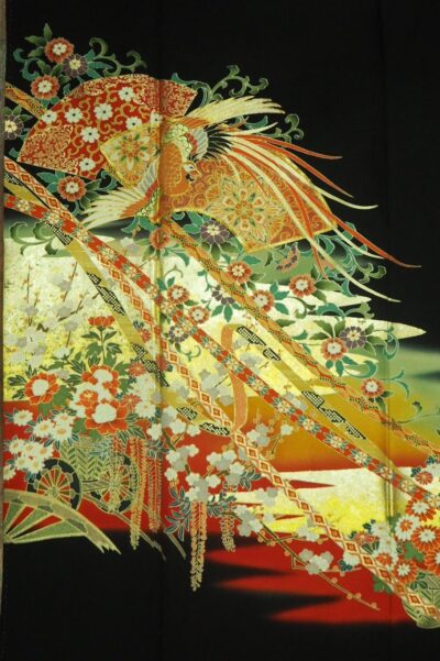 中央の鶴が羽ばたく黒留袖は、個性的ですっきりと見える黒留袖をお探しの方におすすめです。