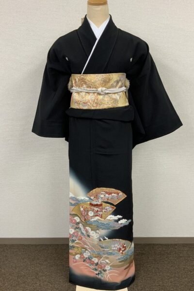 左端は中央に扇が描かれており、シックな色目の落ち着いた黒留袖です。